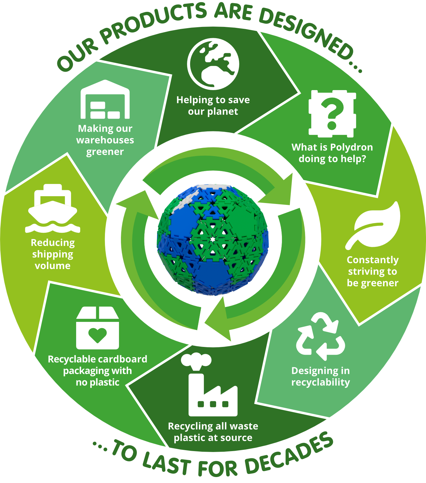 Vele producten van Polydron zijn in 2025 vernieuwd en deels of voor 100% gemaakt van gerecycled plastic natuurlijk goed voor het milieu en de kwaliteit is niet minder geworden. Kinderen zullen er mee blijven spelen.
